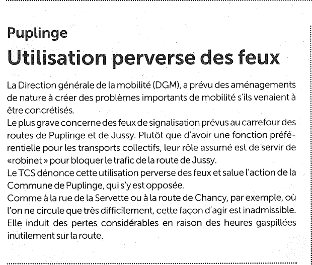 Ceux-ci sont dus au désir du Canton de bloquer le trafic privé dès le carrefour de Mon-Idée par l’installation de feux de signalisation dits « feux-robinets » créant une retenue dès le carrefour de Mon-Idée. Il ne fait aucun doute que cette retenue et le bouchon qu’elle générera augmenteront la pollution de l’air à Puplinge. De plus, ces mesures encourageront les pendulaires à quitter la route de Jussy pour transiter par l’intérieur du village, aggravant les nuisances et les problèmes de sécurité auxquels la Commune est déjà confrontée.
